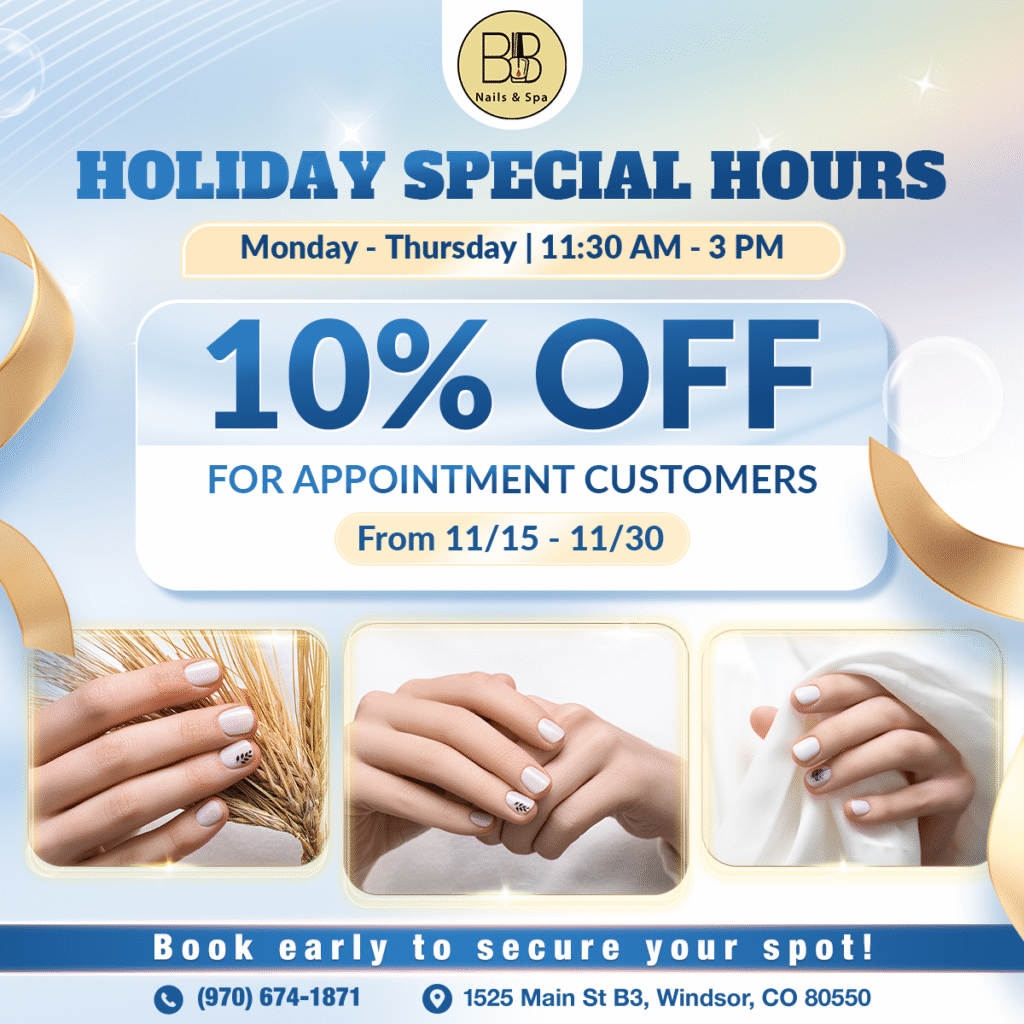 Welcome to B B Nails & Spa, your go-to destination for beautiful nails and relaxing treatments in Windsor, CO. Located at 1525 Main St B3, Windsor, CO 80550, we specialize in everything from spa manicures and pedicures to Gel X, dipping powder, acrylic, builder gel, and custom nail designs. We also offer professional waxing services and gentle treatments for kids. Our talented team is dedicated to giving you a personalized, top-quality experience in a clean and welcoming space. Whether you’re treating yourself to a quick polish change or a full spa day, we’re here to help you look and feel your best.